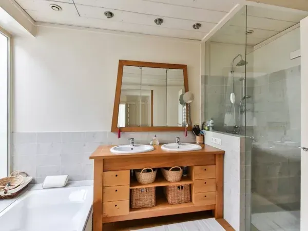 Soap dispensers, toothbrush holders, etc. wiped clean and all products arranged in a pleasant, organized manner